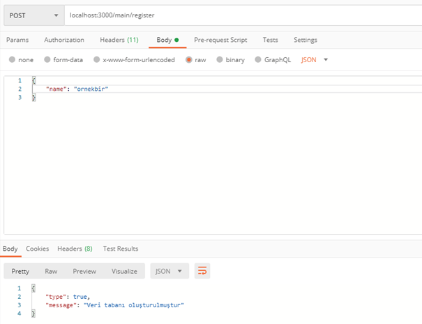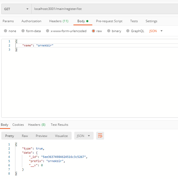 Gerçekleştirdiğimiz get isteğiyle oluşturduğumuz veri tabanı listesini görüyoruz. Görüldüğü üzere ilk kaydımızla birlikte modelimiz oluştu ve kayıt için otomatik olarak bir id atandı.