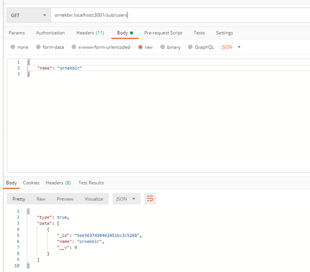 Artık projemizi npm start ile başlatıp postman üzerinden test edebiliriz. Eğer kaydettiğimiz tüm veri tabanlarının ismini görmek istiyorsanız business dosyasını içerisine aşağıda ki gibi bir get metodu yazabilirsiniz.