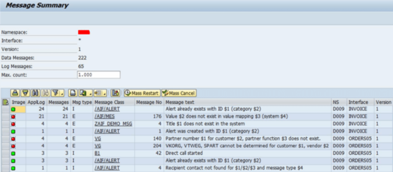 Mesaj özeti, belirli bir log mesajının uygulama loguna ne sıklıkla yazıldığına ve kaç farklı datanın logu olduğuna dair genel bir bakış sağlar. Kullanıcı tüm mesajları belirli bir hataya göre görüntüleyebilir ve hatadan etkilenen mesajlar hakkında net bir bilgiye sahip olarak tüm mesajlar için toplu yeniden başlatma veya toplu iptal işlevini kullanarak sorunu kolayca çözebilir.