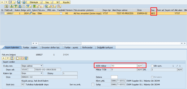 3. İlgili uyarlamaları atadığımız AEO Kullanıcısı ile sayım işlemini başlatalım. Test süreci için sistemde 100 ADT olarak gördüğümüz EWMS4-02 ürününü 90 adet olarak sayalım. (Miktar bazında %10 fark)