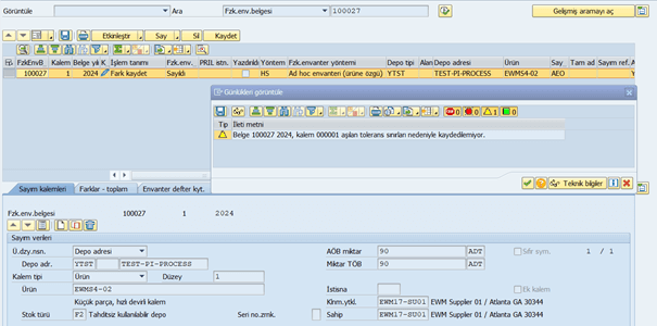 4. Sayım işlemini tamamlayıp fark kaydı yapmak istediğimizde, bu işlemi AEO kullanıcısı ile yaparsak sistem aşağıdaki hatayı verecek ve belgeyi kaydetmeyecektir.