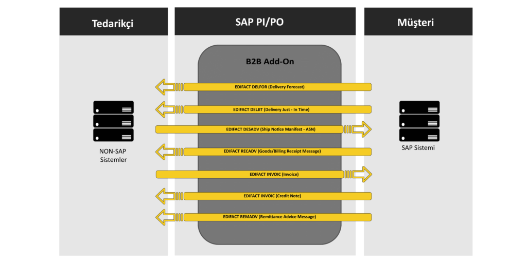 SAP PO modülünün içerisinde yer alan B2B Add-On, ticaret ilişkisi içerisinde olan firmaların ERP sistemleri arasında kurulan bir köprü görevindedir. B2B Add-On, bir firmanın EDI tabanlı tüm entegrasyon ihtiyaçlarını tek bir bileşen ile karşılar. Tüm işlemler SAP sistemi içerisinde – başka bir EDI aracına ihtiyaç duyulmadan gerçekleştirilerek maliyetten ve zamandan tasarruf edilir. B2B Add-On, özel B2B formatlarını işleme yeteneğine sahiptir. EDI’nin en yaygın standartlarından biri olan EDIFACT’in tüm sürümlerini destekler. Çok çeşitli teknik konektörler, B2B Add-On tarafından desteklenmektedir.