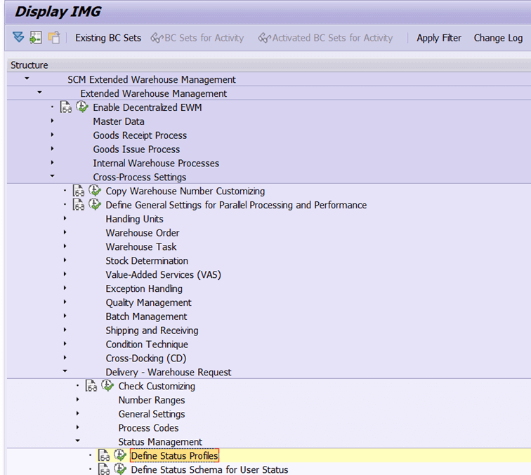 a. In customizing for SCM Extended Warehouse Management, go to Extended Warehouse Management → Cross-Process Settings → Delivery-Warehouse Request → Status Management → Define Status Profiles.