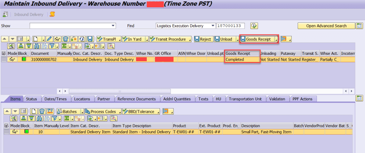 a. Open the EWM inbound delivery document, choose the Goods Receipt, and check whether the Goods Receipt status turns into Completed