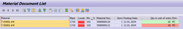 f. Check the Material Document List for the material T-EW01-##. It shows the reverse goods receipt movement typ