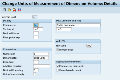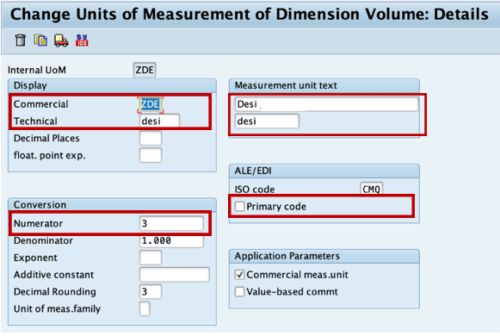 Materials can be managed through different volume units; SAP has many standard measurements and you can also create a new unit for your process’ needs. The calculation of desi was completed by using cubic centimeters and additional configurations.