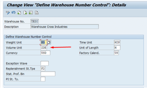 There is an additional configuration you need to complete so that you can display volume in ZDE Unit in the warehouse monitor. In warehouse number control, you need to update the volume unit as ZDE, so that the system uses ZDE as the default unit of measure for volume.