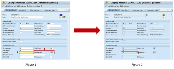 In Figure 1 you should update volume unit as ZDE in box number 1 and leave box number 2 empty. Then save material. Thus, the system will calculate volume in ZDE automatically and you can display it if you go to Basic Data 1 again as shown in Figure 2.
