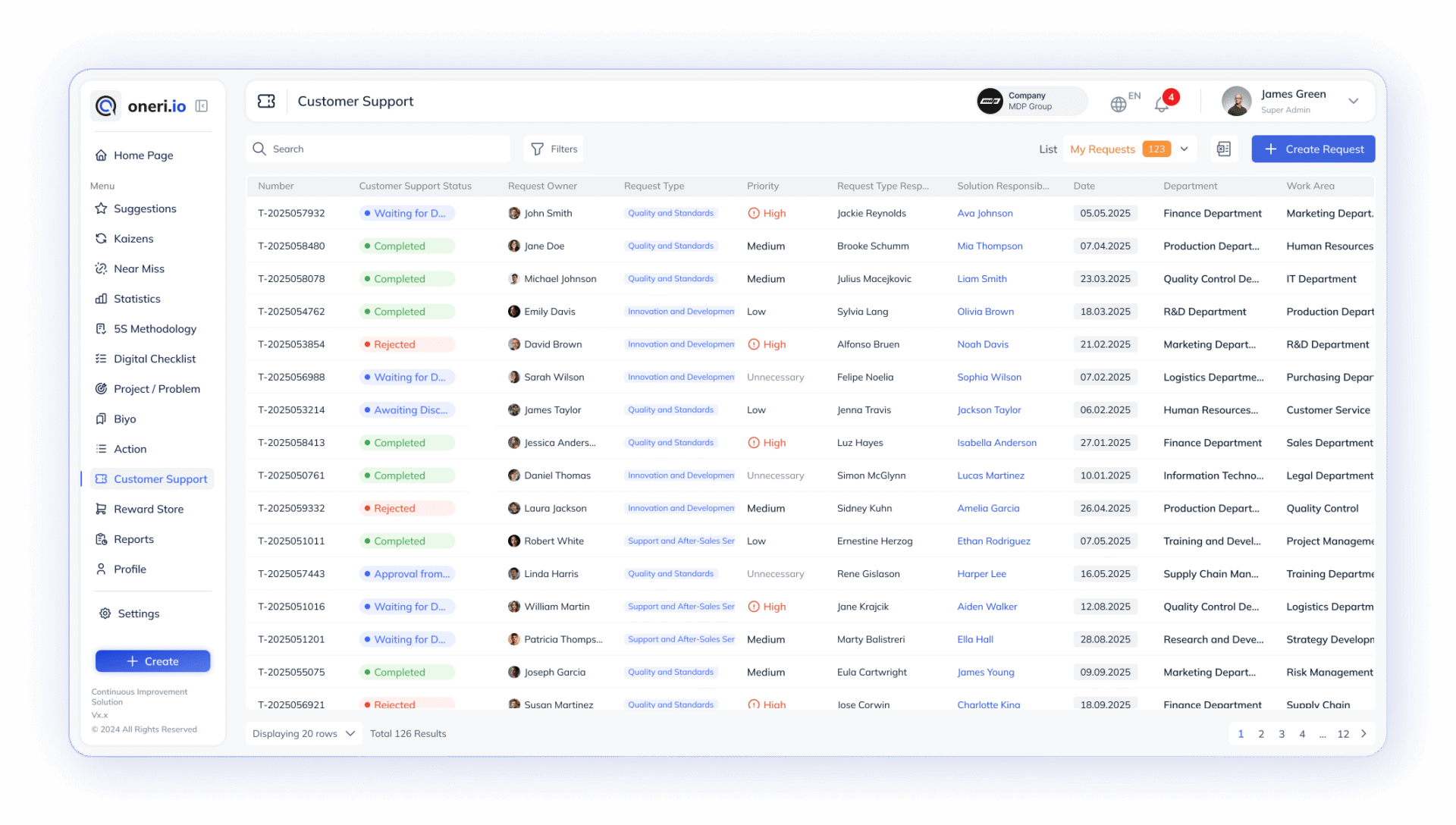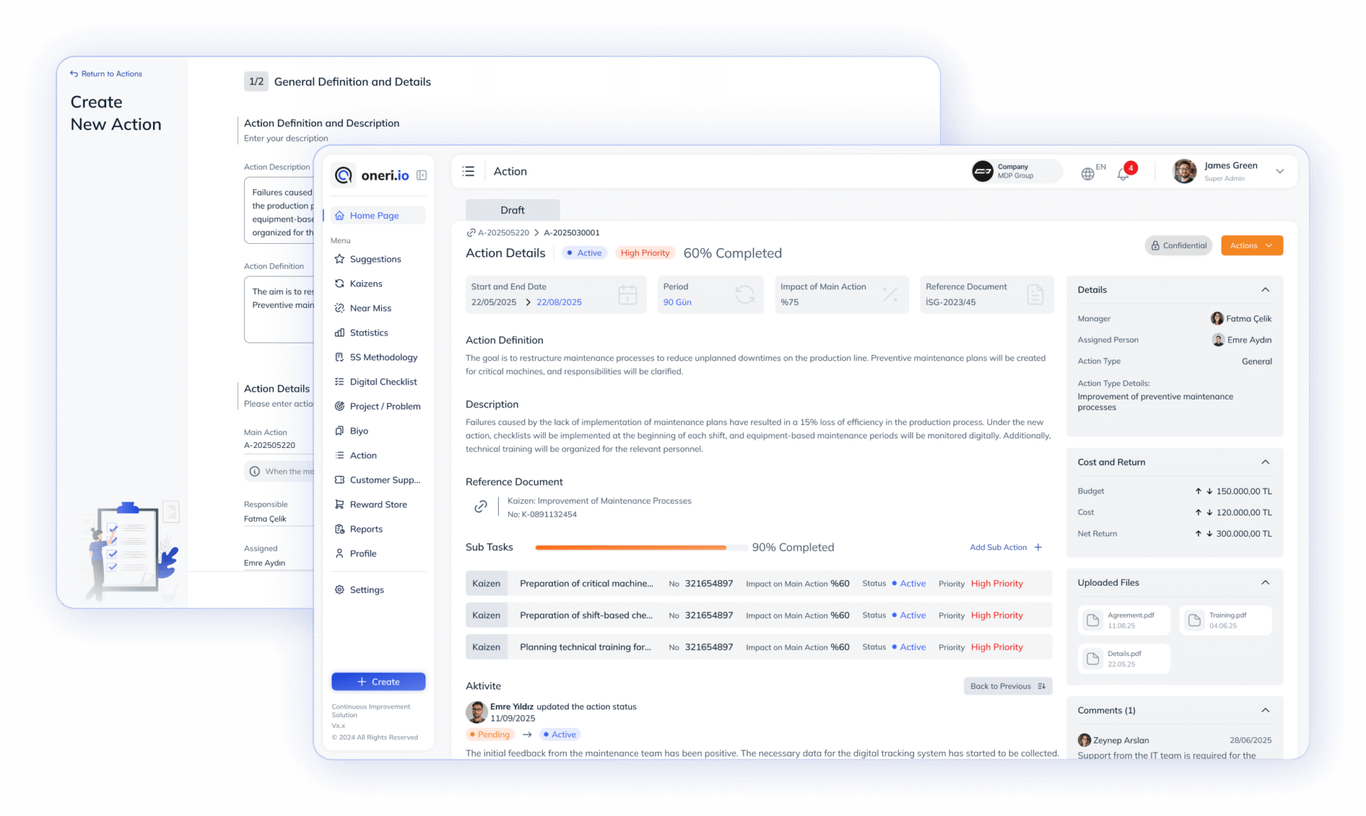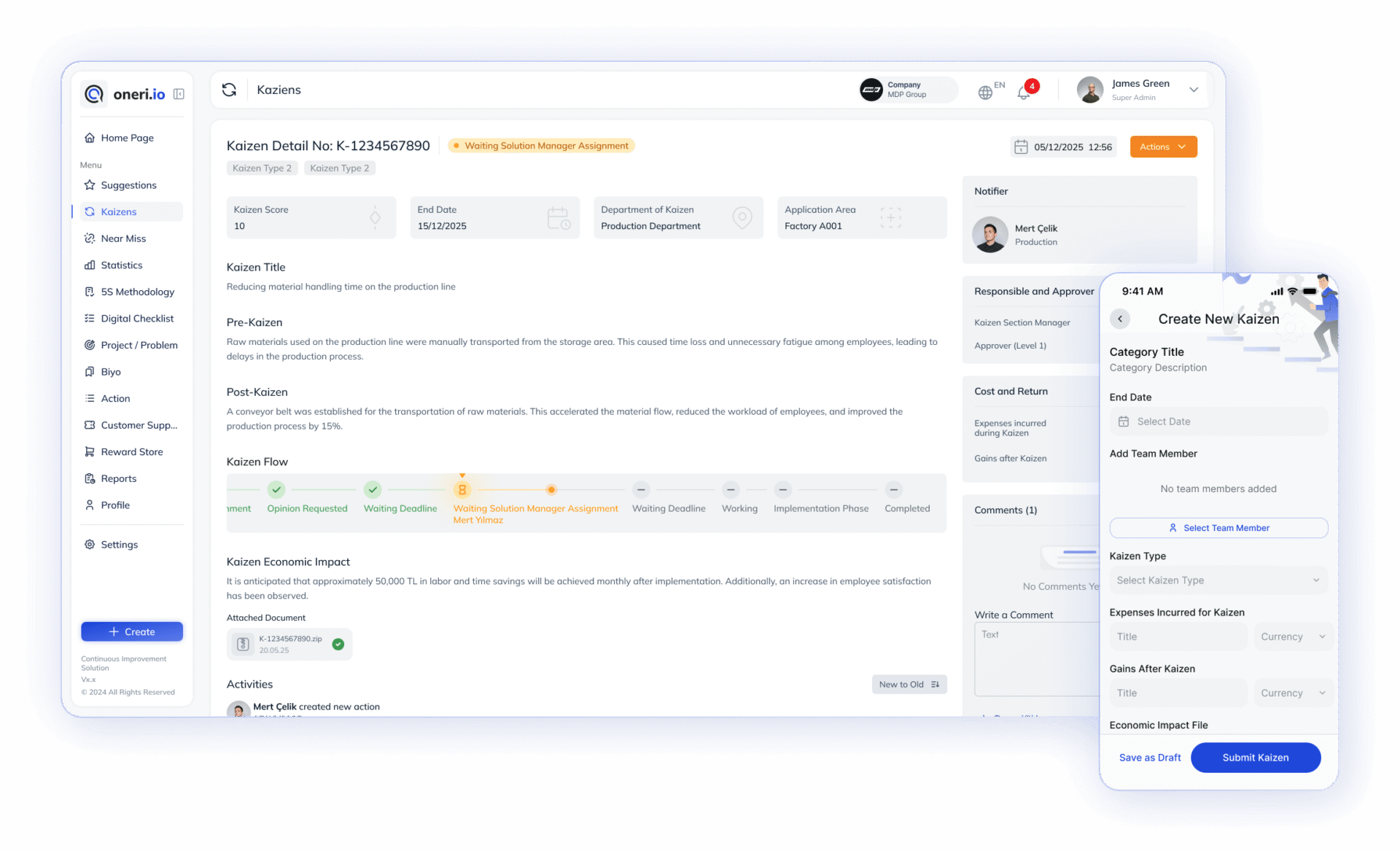 Manage improvement projects digitally with our Kaizen solution, enabling systematic and measurable progress. Stakeholders can track every stage of the process, while managers can easily evaluate costs and expected outcomes